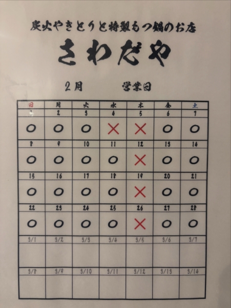 【2月の営業日】香里園の炭火やきとり「さわだや」