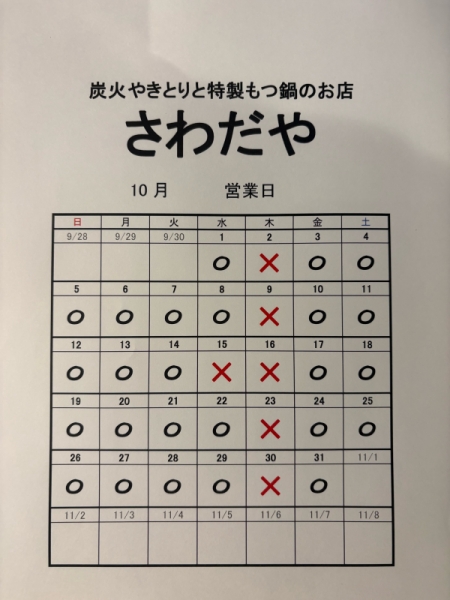 【10月の営業日】香里園の炭火やきとり「さわだや」